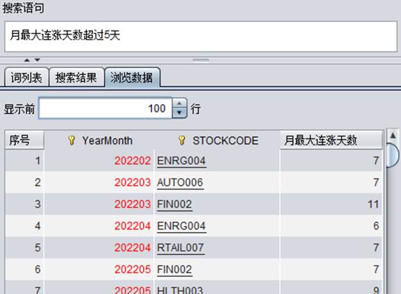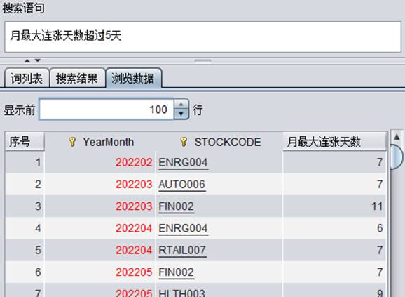 SPL函数的功能很强,因此可以使用分组内的数据,执行一些更为复杂的计算,如下面的月连涨天数指标: