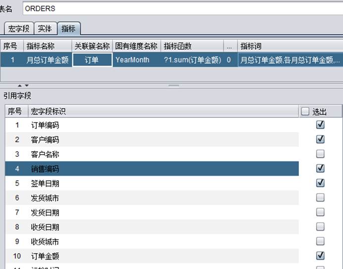 定义指标时,可以指定一个固有维度,这里由于是按月统计,因此指定固有维度维YearMonth。与前面的宏字段表达式或者常数词中的表达式不同,这里的指标函数使用的是SPL函数,其中?1表示按固有维度或者查询维度分组后,组内记录构成的排列,这里月总订单金额即为组内订单金额求和。
