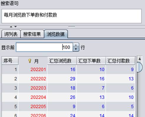 这里的浏览数、下单数和付款数,分别统计了不同事件类型的访问事件。这些指标并没有设定固有维度,如果查询时不指定维度将针对表中所有数据统计。当各个指标的固有维度相同时,可以同时查询多个指标,如: