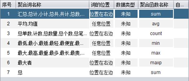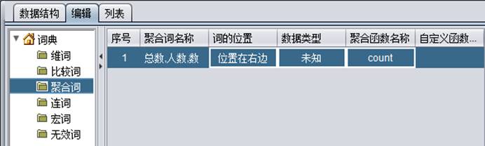 通过聚合词,可以在查询中执行聚合计算。例如,在编辑页面的词典项中选择聚合词,并在菜单栏中选择编辑 - 追加行,添加用来计数的聚合词: