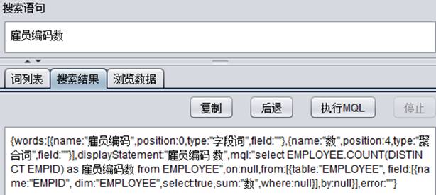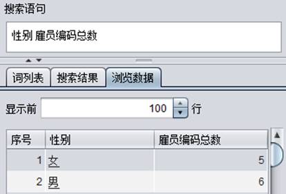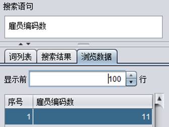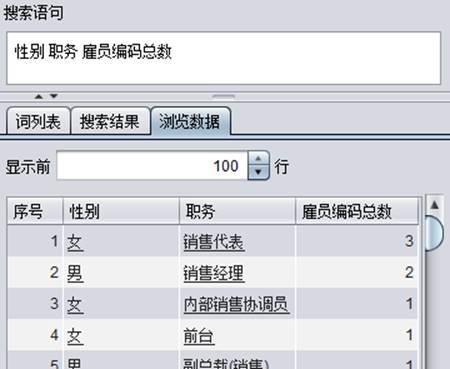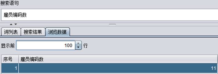 按照设定,聚合词“数”在需要计算的字段词的右侧,即计算数据中“雇员编码”的总个数,再看一下搜索结果中的详细信息: