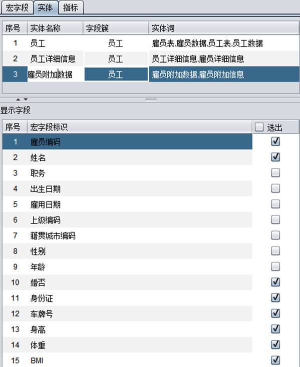 这里用到了身高数据,如果想使得结果能够查到,员工数据这个实体关联的字段簇中,必须包含身高这个宏字段: