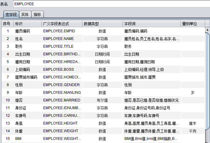 有了员工的身高与体重数据,就能够计算他们的BMI指数了,上面添加了宏字段BMI来处理。