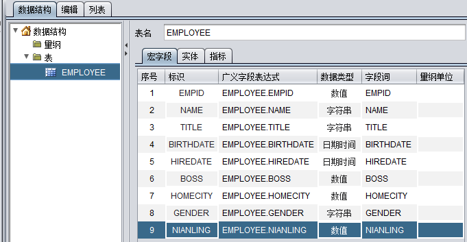 可以看到,导入数据的窗口中可以选择元数据中定义的表和字段,表列表中所有的表和假表,字段列表中也列出了所有的普通字段、外键以及伪字段。这里先只导入员工表EMPLOYEE,选择它的所有字段,并选择【加载并更新词典】,导入后结果如下: