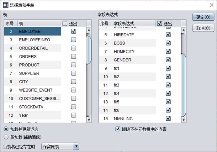 可以看到,导入数据的窗口中可以选择元数据中定义的表和字段,表列表中所有的表和假表,字段列表中也列出了所有的普通字段、外键以及伪字段。这里先只导入员工表EMPLOYEE,选择它的所有字段,并选择“加载并更新词典”,导入后结果如下: