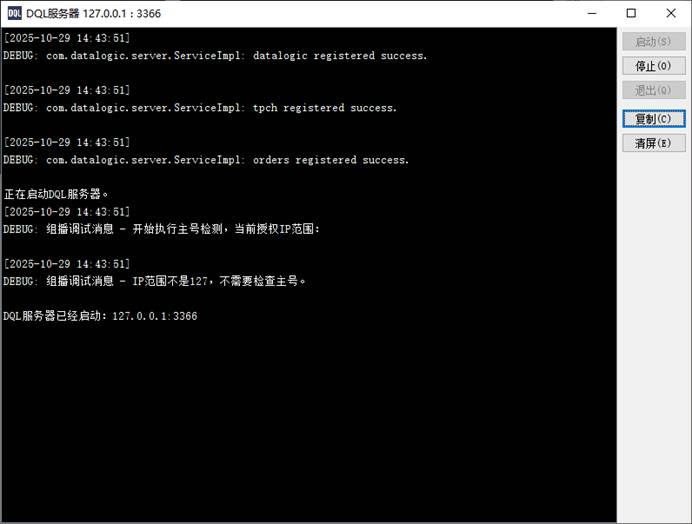 报表安装后,会自带HSQL数据库和在它基础上集成的DQL服务器,在安装根目录的report\bin中,可以执行startDQLSERVER.bat启动DQL服务器窗口(如果是Linux版本等也可能执行startDQLSERVER.sh),启动时,会自动启动使用的HSQL数据库。DQL服务器窗口如下,需点击“启动”开始运行服务器: