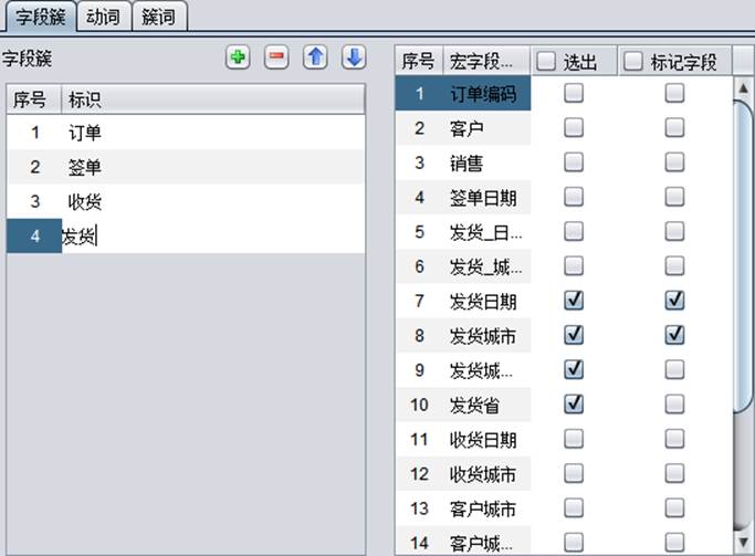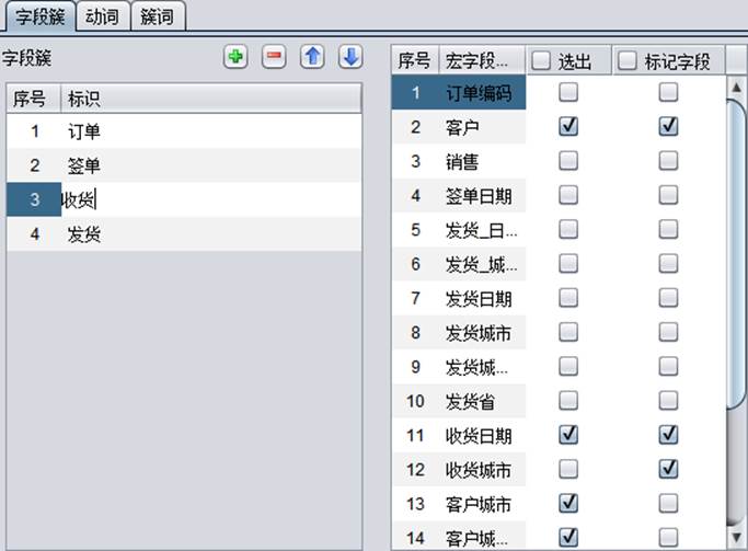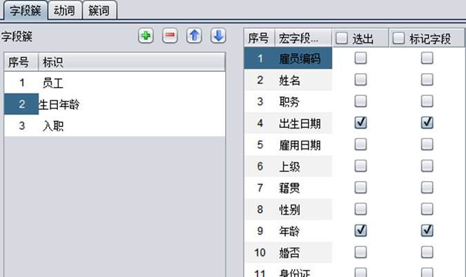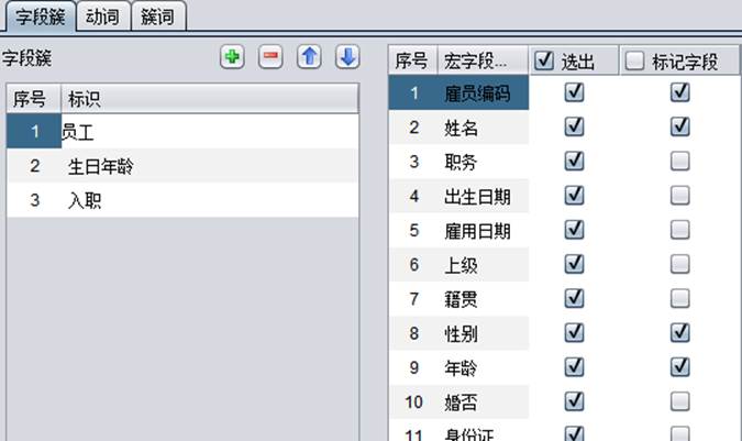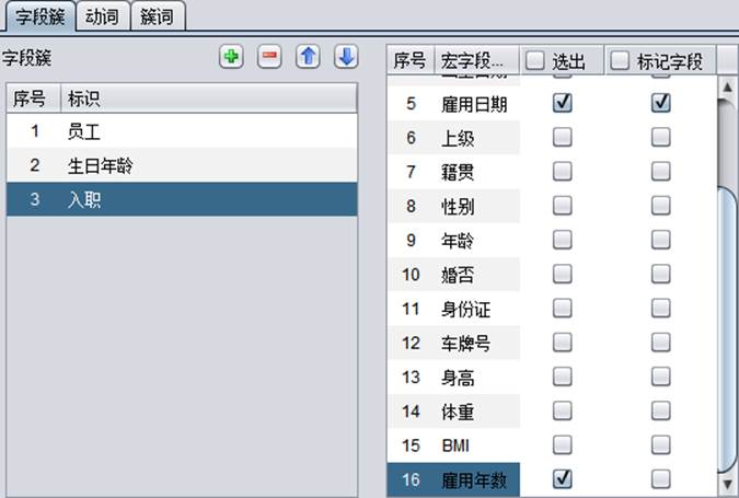 在定义字段簇时,右侧的标记字段,用来表示当前字段簇的最关键信息,其中“雇员编码”这样类似主键的字段必须选择。
