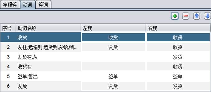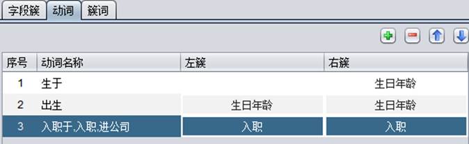 在口语化的语句,并不一定使用字段词以及它的值这样的名词式查询,还可能会使用动词描述。举个例子,“出生日期是1990年”也可能被描述为“生于1990年”或者“1990年出生”“出生晚于1989年4月”这样的方式。有了字段簇定义,就可以通过定义动词与字段簇的关联,解决这样的问题。选择字段簇右侧的动词选项卡,可以定义动词,如: