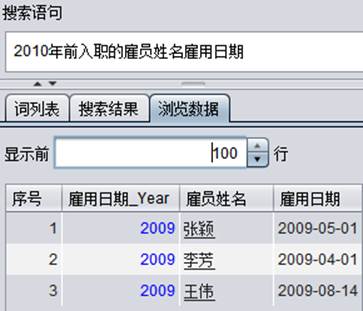 在这里,将“入职”左侧的条件“2010年之前”作为“左簇”与字段簇“入职”匹配查询。在上面的动词定义中,“入职”也可能会和“右簇”匹配使用,如: