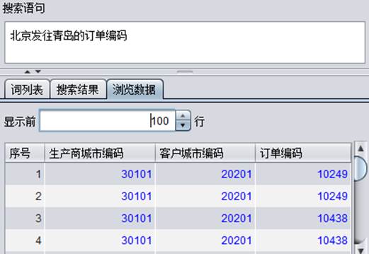在字段簇中包含多个字段,同一个字段簇中各个字段的类型或者对应的维应该设置为不同的,所以在上面的搜索语句中,“北京”“青岛”这样的“城市”维中的常数词,或者“MAISD”这样的客户编码,都未指明字段,但通过动词可以在对应的字段簇中,按照类型或者维来自动匹配,得到所需要的结果。如果查询时使用多个查询词,也会自动判断,如: