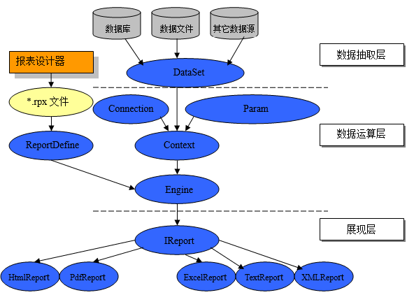 (1) 数据抽取层:用于将原始数据通过接口IDataSetFactory抽取成报表能进行各种运算的数据集。原始数据可以来自数据库、数据文件,如Text、XML等,也可以是由用户自定义的数据存储对象。而抽取的数据最终用一定的格式在DataSet中存储,即在数据集对象中存储。