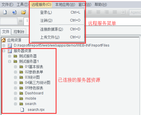 按照上述步骤配置完成后,重启润乾报表设计器,报表主菜单中会显示远程服务菜单,如下图:
