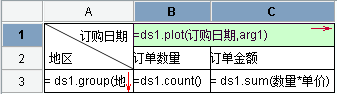 (1) 在B1单元格输入表达式:=ds1.plot(订购日期, arg1)
