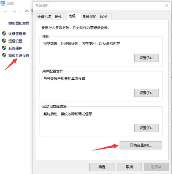 2.点击高级系统设置,弹出窗口后点击【环境变量】,再弹出如下窗口: