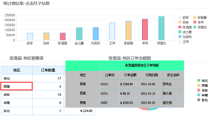 用设计器打开报表统计图钻取.rpx,通过在单元格中加入超链接将雇员姓名和地区做为name(雇员姓名)和region(地区)的参数值传递给明细.rpx,实现钻取效果。