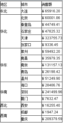 从上面的这个报表可以看出,这是一个分组报表,左边按照地区维度进行了完全的分组,整个报表被分成东北、华北、华东、华南、西北、西南等6组,我们看一下这样的报表在润乾报表中是如何设计的: