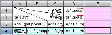 (3) 在E4单元格输入表达式:=ds1.sum(数量*单价,产品ID in ds4.select(产品ID) and 雇员ID==C4)
