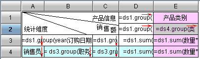 E3格中的表达式为:=ds1.sum(数量*单价,产品ID in ds4.select(产品ID))。其含义是:年月为C3时产品ID为E2的产品销售额之和;可以看出,这个表达式既和上表头E2格有关联,又和左表头C3格有关联。