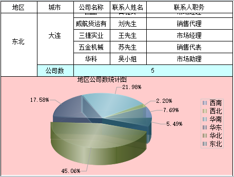 如下图所示,通过与饼形图相结合,了解分组报表中每个地区的公司个数占公司总个数的百分比: