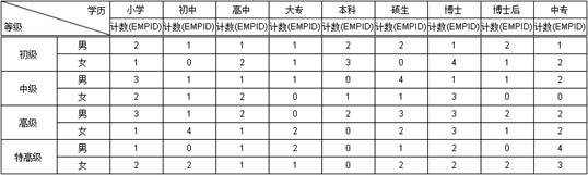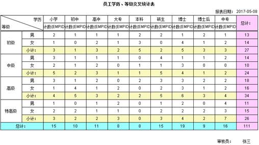 如下图所示,这个是一个典型的多层交叉报表,行定义为等级与性别,列定义为学历,汇总数据为计数;本章节中,我们会以该报表为例介绍交叉报表的制作步骤,该报表所用数据源为系统自带的demo数据源。