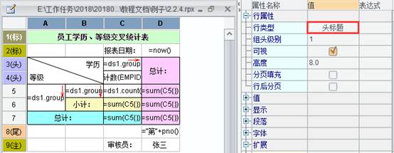 第一步:在报表的最上端插入两行,选中新插入的行,在右侧属性栏中设置这两行的行类型都为“头标题”。在最下端追加两行,设置最后一行的行类型为“尾标题”,倒数第二行的行类型为“报表尾”。