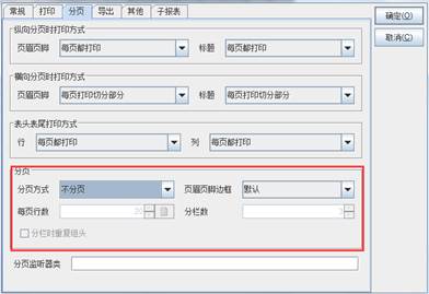 在报表菜单中选择报表 - 报表属性,弹出报表属性窗口,选择“分页”标签,将【分页方式】设置为:不分页,点【确定】完成设置。如图所示: