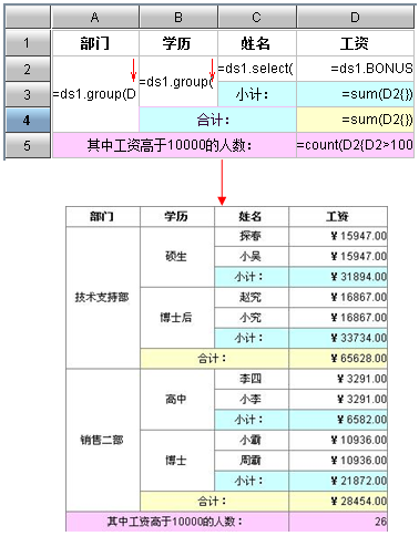 在上一小节例子的基础上我做一点改动,将D5单元格的表达式改为:=count(D2{D2>10000}),该表达式的意思是统计工资高于10000元的人数。具体用法请参见: 格集的条件表示法
