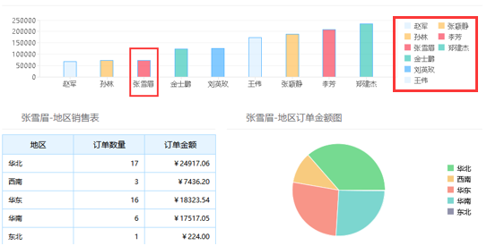 点击柱形图上的柱子时,通过使用超链接再次访问当前报表,同时将@legend/@category获取的当前所点击的柱子所在的系列值/分类值作为姓名参数值回传给报表。这样在展现报表时,地区销售表和地区订单金额图则会根据超链接所传递进来的不同姓名而变化。