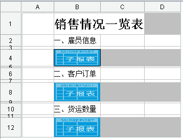 2, 在B4单元格上点右键,在下拉菜单中选择【子报表】,如下图所示: