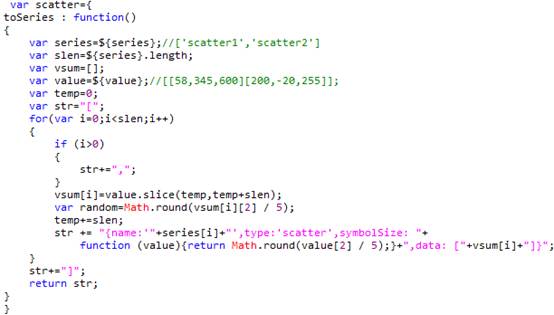 如上所示html文件中series:[]部分为需要处理的内容,其中scatter1和scatter2是两个系列,如不通过js中添加脚本进行处理,那么则需要手动在js的series部分追加scatter3,scatter4…..系列,操作比较麻烦。因此我们在js中添加了脚本处理数据,方便用户只需要在左侧参数部分传入数据即可,右侧则会自动根据分类系列系列值进行拼接字符串。最终将拼接好的串加到serices:[]中。