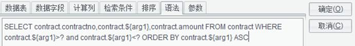 在生成SQL语句时,可根据实际需要切换到相关tab页编辑计算列、检索条件、排序等属性。如果SQL语句中需要传入参数,则需要在“参数”Tab页和填报文件的参数列表中定义参数名。