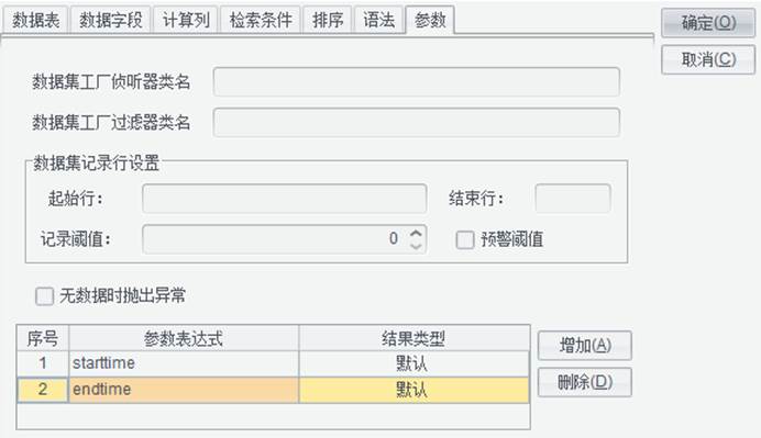 名称可以使用默认的,也可以根据需要自己编辑,数据集和表达式中引用参数时,用的就是它的名称。比如:starttime。