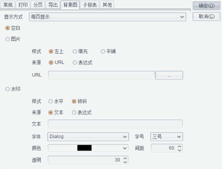 URL或表达式:与“配置类型”选项相对应,URL可以是绝对路径或相对路径,也可以将url设置为http路径。如果是相对路径,在web 应用中发布时会依次查找应用根目录à报表主目录。如果是表达式,则表达式的计算结果需为图片,如二进制流,比如:employee.select(雇员ID==B3).照片。