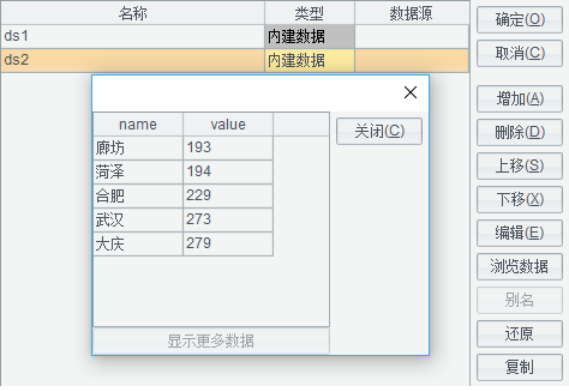 在上面的界面中,【增加】按钮用于添加一个数据集;【删除】按钮用于删除数据集列表中选中的数据集;【上移】、【下移】可以改变数据集在数据集列表中的位置;【编辑】按钮可以修改数据集列表中选中的数据集定义;【浏览数据】按钮可以查看数据集包含的数据信息;【别名】按钮可以为记录集中的字段起别名,当从数据源取字段时,很多情况都是英文字段,这时可以通过数据集字段中文标题设置界面,给每个英文字段名附上中文名,我们在制作报表时,从数据集取字段名时可以使用中文名了,这样给不熟悉数据集里英文字段具体含义的用户带来了便利,当数据集类型为内建数据集时,不用设置中文名称,可直接修改字段名为中文即可;【转为内建】按钮可以把外部数据集转为内建数据集,所谓内建数据集是指报表中的数据是存储在报表模板中的。通过点击【复制】按钮,可复制选中的数据集,按住ctrl键,可复制多个数据集;打开其他报表,通过点击【粘贴】按钮,可将复制的数据集添加到其他报表的数据集配置界面。
