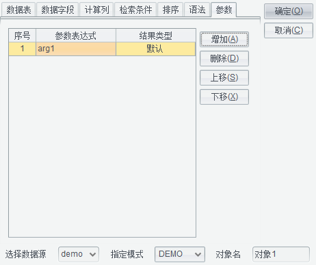 通过【增加】按钮可以增加一个对象,并设置回填SQL语句。回填SQL语句中,必须设置主键,在选出的字段中,需要设置数据回填时的表达式,“表达式”格式为:对象名.字段名、字段名或者以等号“=”开头的表达式。例如:=arg1,此时arg1为填报文件的参数列表中定义的参数名。