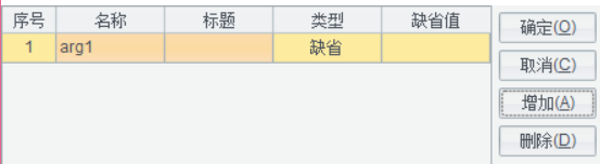 在参数定义界面中,点击【增加】按钮,可添加一个参数定义,你可以编辑参数的名称、标题、类型、缺省值等属性;在参数列表中选择一个参数,点击【删除】按钮,可删除该参数。编辑完点击【确定】按钮即可。