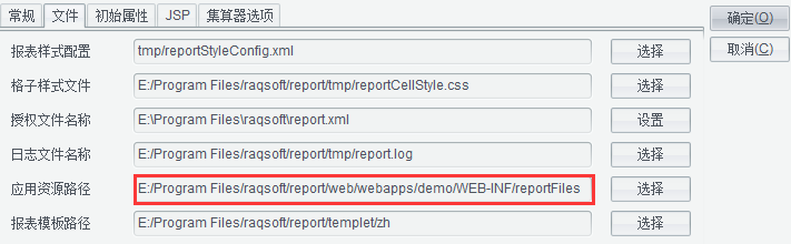 (1)在润乾报表设计器中启动内置的tomcat 上传时,上传路径为填报 - 选项 - 文件中设置的应用资源路径,需要注意的是当修改应用资源路径后,需要重启服务器才会生效。