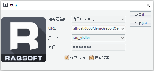 访问远程服务器时,填写可用的用户名和密码。默认提供的报表中心服务器的用户名/密码:raq_visitor/a000000。