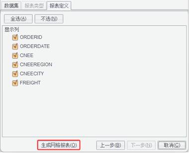 第三步,“显示列”列出了所有可供显示的列名,选择需要在报表里显示的列名,然后点击【生成网络报表】按钮,就进入了报表编辑界面,到此一张网格式报表就建好了。如果显示列里的所有列名都需要在报表里显示出来,可以全选,也可以在第二步中,选择网格报表之后,直接点击【生成网格报表】按钮。