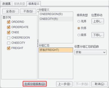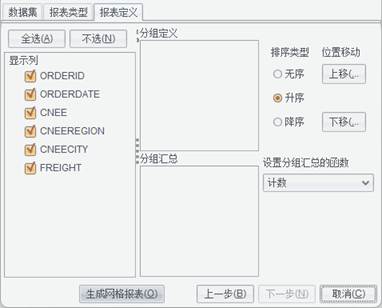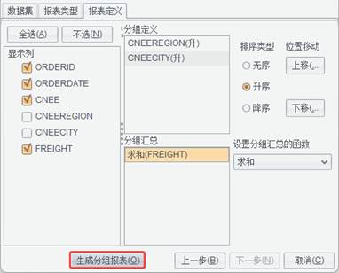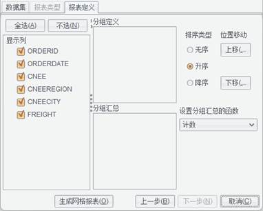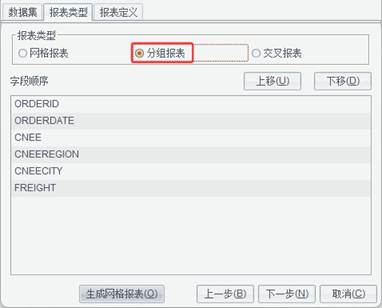 选择分组报表类型后,点击【下一步】按钮,进入分组报表定义界面: