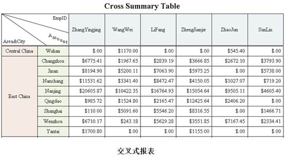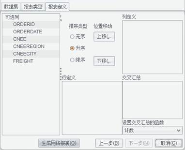 如果要通过向导做交叉表,则在第二步中选择交叉报表,点击【下一步】按钮。进入交叉报表定义界面: