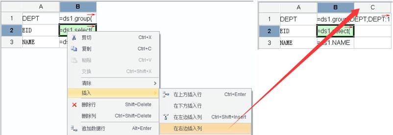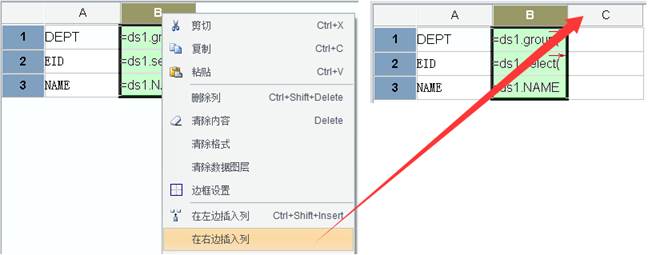 本菜单项的功能是用于在选中的列或选中的某一单元格右边插入一列。