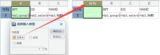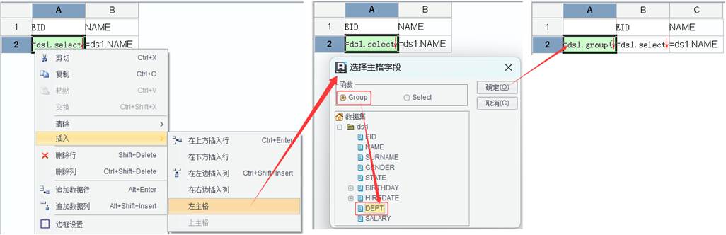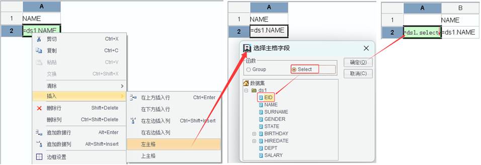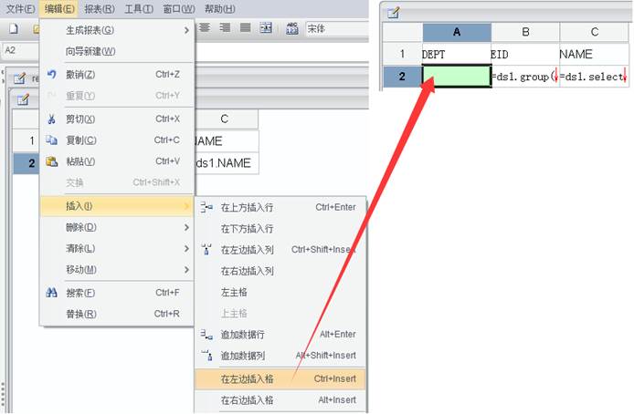 选中某一单元格,点击 编辑à插入à左主格,或者 右键菜单à插入à左主格,可在选中的位置左边插入一列并为其设置左主格的表达式。如下图所示,选中A2单元格: