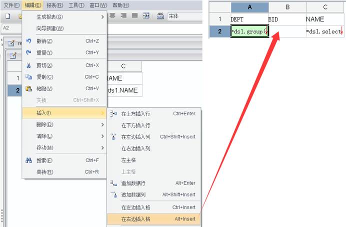 通过选中某任一单元格,点击 编辑à插入à在右边插入格,或者使用快捷键Alt+Insert,可在选中的位置右边插入一个单元格。如下图所示,选中A2: