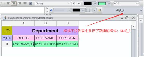 点击【确定】按钮后,在设计器工具栏的样式下拉列表里就会列出刚刚定义的样式名。如下图所示: