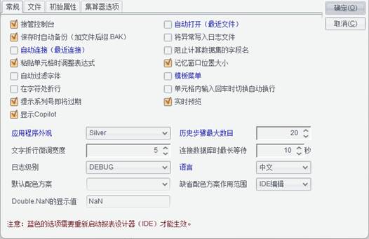 ● 蓝色的选项修改后,需要重启报表设计器才能生效。