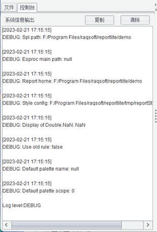 是否将运行报表日志写到控制台中,如果该属性没有打勾,那么设计器左侧就没有 控制台 面板。如果该属性打勾了,那么我们可以在设计器左侧 控制台 面板查看系统日志信息。