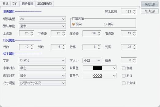 在选项配置窗口中切换到“初始属性”标签页,用于定义新建报表的报表属性、行列属性、格子属性等的默认值,如下图所示: